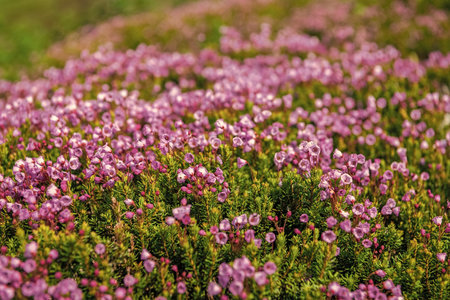 Beautiful purple heather cover in a Filled with of spring sunlight. Soft focused natural seasonal background