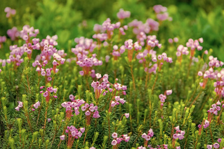 Colorful Erica Flowers Blooming in Garden with Fresh Green Background