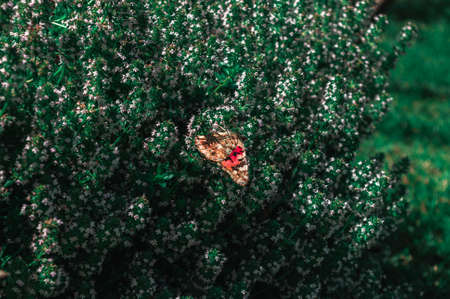 Butterfly hovering over a bush of flowers