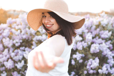 Happy laughing carefree young woman wear straw hat and dress having fun over nature background in meadow with flowers close up. Happiness. Cheerful beautiful girl travel at countryside. Vacation time