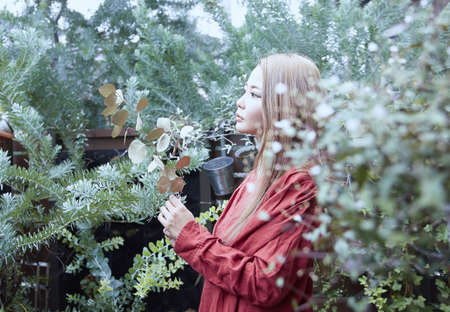 Photogenic images of women dressed in red with light and plants