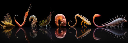 A row of different types of sea creatures, imitation of vintage zoology book illustrations.