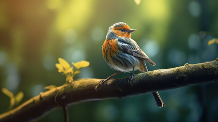 Beautiful background image of a wild robin (Erithacus rubecula) with stunning colors and standing on a branch, generative ai