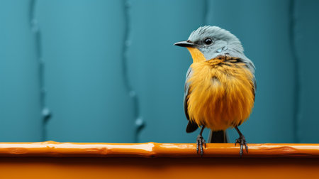 a little bird perches on a metal railing, showcasing a vibrant blend of dark orange and light azure feathers. the bird's plumage also features hints of dark yellow and gray, creating a visually striking contrast. this photograph draws inspiration from the precisionism art movement and reflects themes of environmental awareness. additionally, it incorporates elements of pop culture, resulting in a unique and captivating composition. the