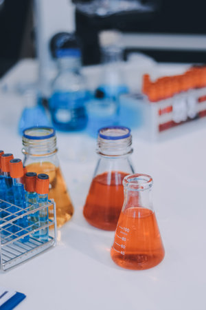 scientific Chemistry glassware for research in laboratory, medicine microbiology or biotechnology technology equipment, coronavirus cure covid-19 vaccine development
