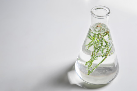 Natural organic extraction and green herbal leaves, Flower aroma essence solution in laboratory.