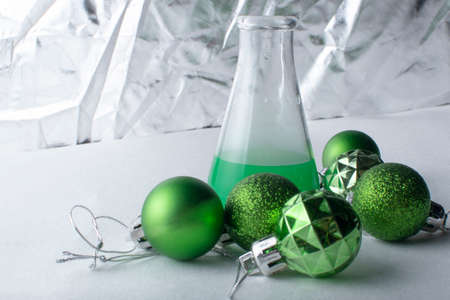 laboratory beaker with green liquid and smoke near cristmas balls on white background.