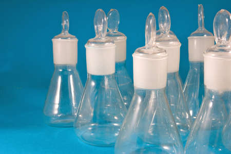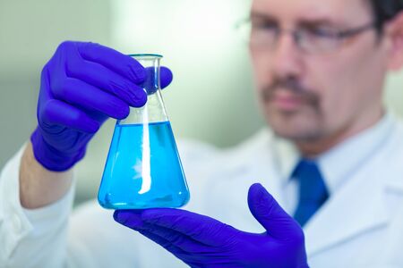 blue liquids in transparent flasks in the laboratory. test or research in lab. Technician testing chemistry lab experiment
