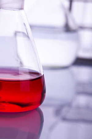 Glass laboratory flask and beaker with liquids for analys or experiment in desk. Chemical experiments