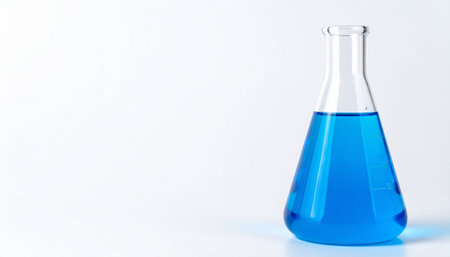 Erlenmeyer flask with yellow liquid in chemistry lab (blue background)