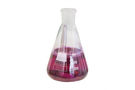 Conical flask with liquid on table, space for text. Toned in violet. laboratory glassware