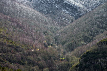 Mountain road through the winter forest, in Cervantes, Lugo, Galicia