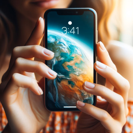 Woman is holding a cell phone with the time 3.41 on the screen. The image of the earth is displayed on the screen, and the woman's hand is positioned over the phone