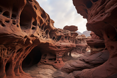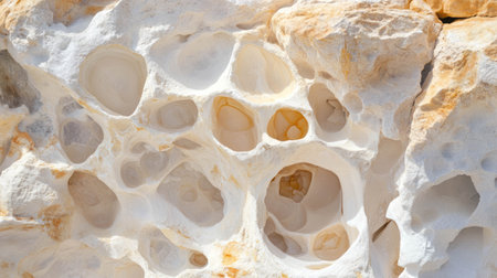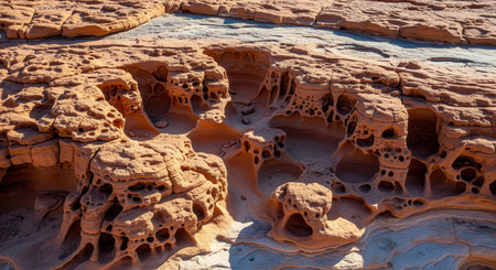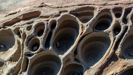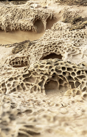 Close-up of intricate honeycomb weathering patterns on sandstone rocks. Showcases natural textures and erosion features. Ideal for geological studies and nature backgrounds.