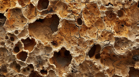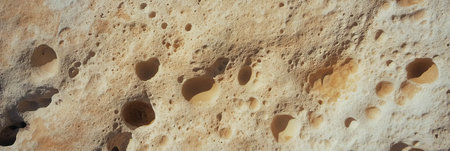 A detailed close-up of porous sandstone rock, showcasing numerous natural hollows and cavities with a rough texture in warm earthy tones.