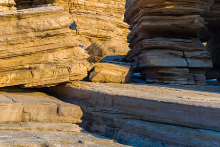 Detailed view of weathered sandstone layers at Triopetra beach in Crete, showcasing textured rock surfaces and warm golden tones in late afternoon sunlight.