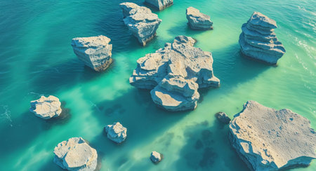 AI Generated. Stunning aerial view of floating rock formations above a turquoise body of water