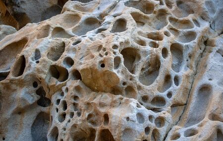 Sandstone panoramic background. Close-up of holey natural sandstone rocks
