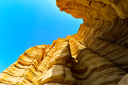 Sydney, Australia - February 11, 2019: Closeup of spectacular rock outcrop at Bronte Beach South cliffs, made by erosion.. Yellows and browns under blue sky. Sponge-like borders of shell like plates sticking out.