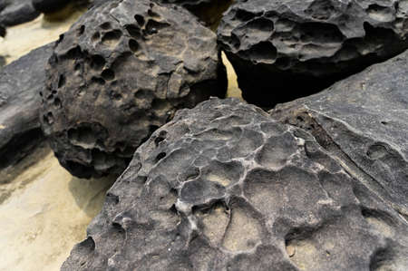 Detailed close-up of a porous black rock.