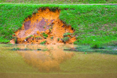 Soil erosion or landslide on the lake in the rainy season at Muadzam Shah, Malaysia.