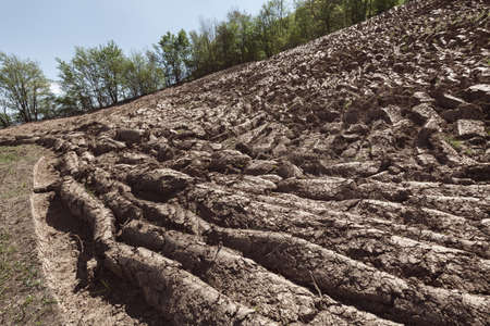 Soil erosion. Formation of gullies in a field due to runoff of rainwater. Sand landslides.