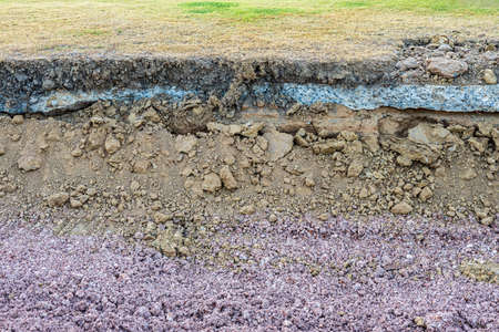 Close-up view of the background of the cross-sectional surface of the basement, which has been demolished until it is loam, the upper layer is grass, the lower layer is purple pebbles.