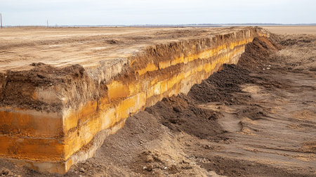 This image showcases the striking geological layers of soil with vibrant color contrast, set against a vast agricultural landscape under a cloudy sky.