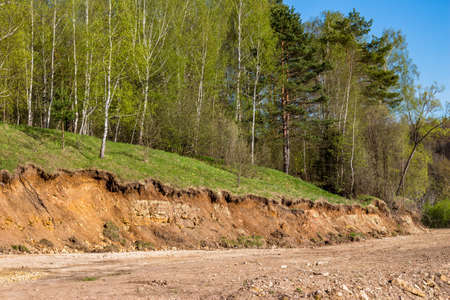 Outcrop of geological rocks. The bedrock is clay and limestone topped with Quaternary deposits. Kaluzhskiy region, Russia