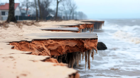 Dramatic close-up captures the raw power of coastal erosion along a rugged coastline. A weathered, brown cliff face, deeply textured and crumbling, battles the relentless waves of the turbulent ocean. Breaking waves create foamy spray and foam against the shoreline. This striking landscape scene highlights the forces of nature and is ideal for illustrating articles on geology, environment, or the impact of sea-level changes. It is perfect for adding visual impact to scientific reports, educational materials, and environmental awareness campaigns.