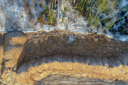 sand quarry in the spring pine forest. Old strong pine trees sticking out of the sandy rock. Mineral resources