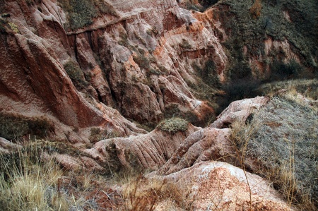 Northern Kyrgyzstan. The unusual texture of red-yellow clay rocks in the famous Skazka Canyon, off the coast of Lake Issyk-Kul.