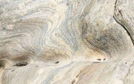 Close-up view of layered sandstone with swirling bands of beige brown grey and white. Cracked texture adds depth to the natural formation.