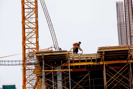 Dnepropetrovsk, Ukraine - 02.10.2022: A worker prepares formwork for a modern metal-concrete structure of a residential building.