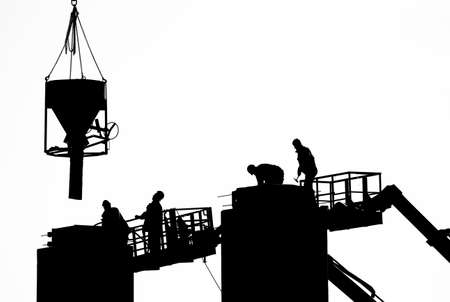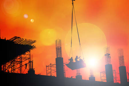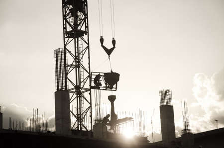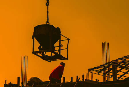 Worker pouring concrete by crane at construction site,silhouette style.