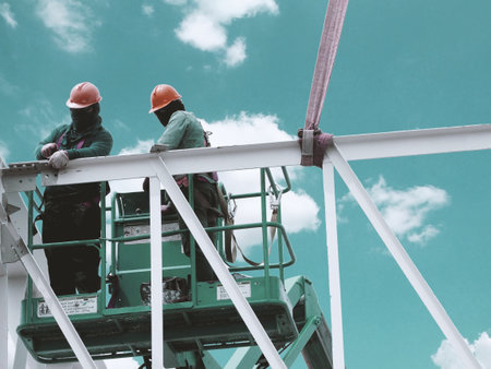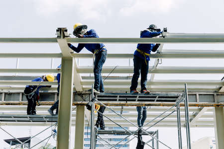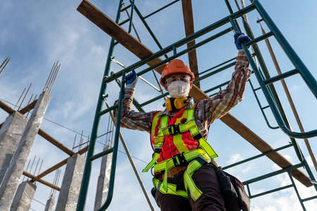 Man Working on the Working at height on construction site with blue sky
