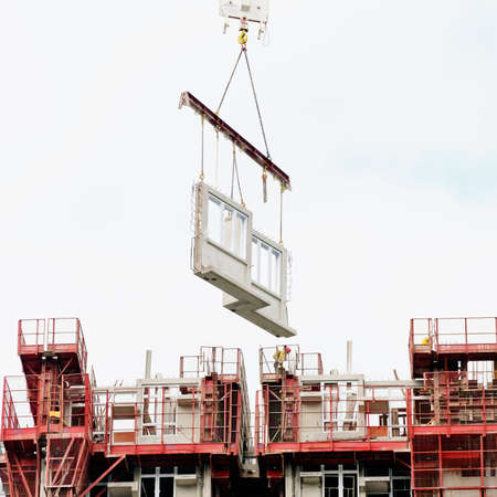 Construction site crane is lifting a precast concrete wall panel to installation building.