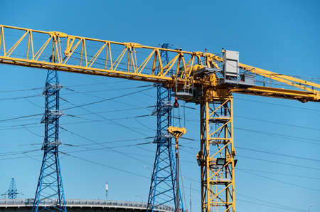 Yellow construction crane boom on the background of power transmission towers and road junctions