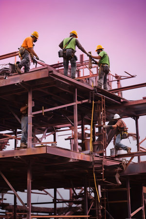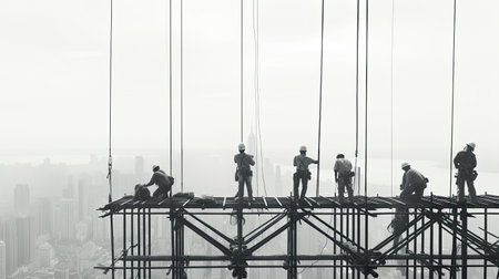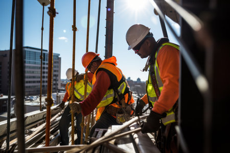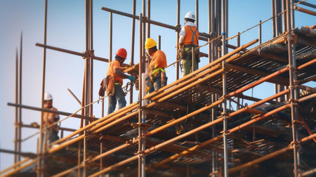 Sunlit construction team diligently working atop a scaffold, emphasizing the importance of safety gear in urban settings.