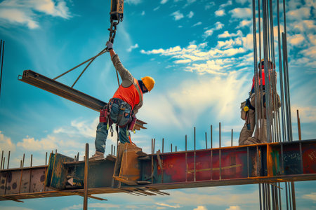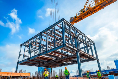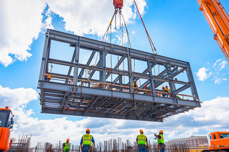 Workers in safety gear guide the lifting of a large steel structure at a busy construction site during daylight. Machinery and cranes are actively involved.