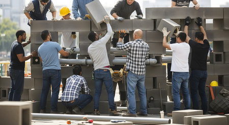 A large, diverse group of men work together outdoors to build a wall out of cinder blocks. They are lifting and placing the heavy blocks, demonstrating teamwork, construction, and community effort.
