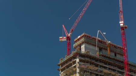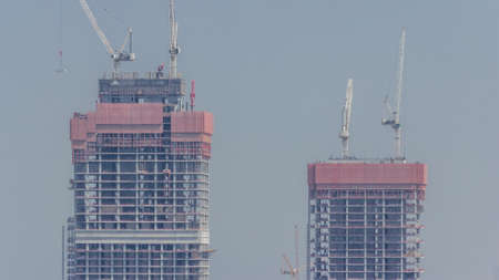 High multi-storey buildings under construction and cranes timelapse