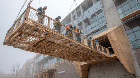 A construction crew operates a crane to carefully lift a large wooden platform at a commercial building site, shrouded in fog. Safety measures are visible.