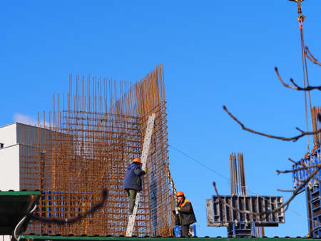 Dnipropetrovsk, Ukraine - 11.22.2021: A worker prepares a frame from rebar for pouring concrete into a load-bearing beam of a residential building.