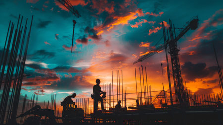 A construction site at sunset, with silhouetted workers and machinery against the colorful sky, creating a dramatic scene.