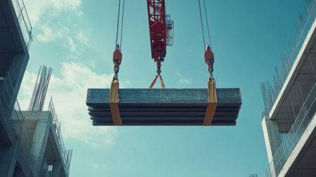 A crane operates at a construction site, lifting a heavy concrete slab against a clear blue sky. The image highlights industrial work, machinery, and modern architecture.