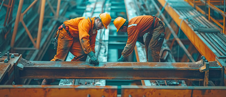 Two construction workers are on a building site with a crane and a blue sky in the background, working on the structure