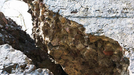 Cracks and texture showcase the aging and deterioration of this weathered wall revealing layers of earth and paint.