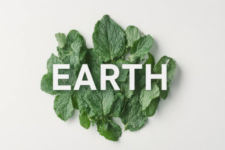 Fresh mint leaves arranged on a white background with the word EARTH, symbolizing sustainability and healthy living, ideal for organic product promotions