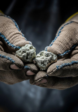 Gloved hands hold a rough chunk of raw mineral ore containing metallic crystals, likely pyrite or galena, mixed with gold tones. The macro shot highlights the texture and shine of the valuable geological specimen.